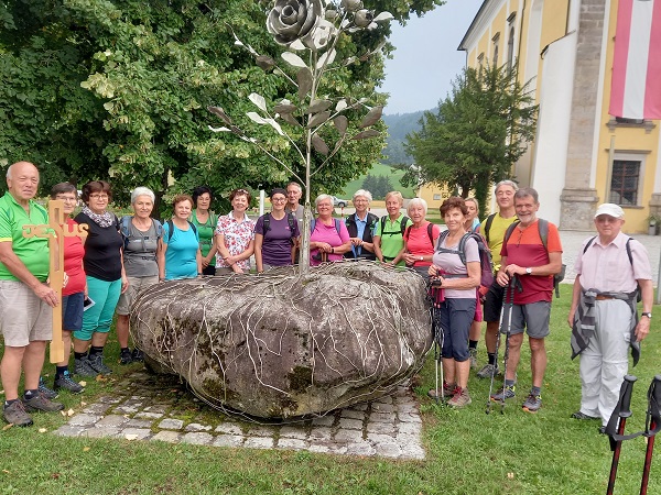 Die Pilgergruppe vor der Friedensrose in Waldhausen; links Peter und Marianne Haberfehlner, rechts Pfarrer Karl Wöginger.